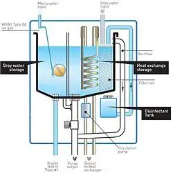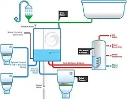 When recycling water from a bath (100–150 litres) or shower (50–80 litres) the waste water temperature is circa 20–25 °C. An in-house greywater recycling tank holds 150–175 litres allowing for the majority of waste water to be stored. Utilizing a built in copper heat exchange with circulation pump the residual heat is recovered and transferred to the cold feed of a combi-boiler or hot-water cylinder, reducing the energy used by the existing central heating system to heat water.