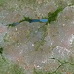 A satellite picture of Ouagadougou showing that the catchment area of Lake Ouagadougou that supplies more than a fifth of its drinking water supply is fully urbanized