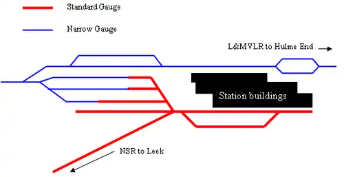 The station was the terminus of two separate railway lines; the 4 ft 8+1⁄2 in (1,435 mm) standard gauge NSR branch from Leekbrook Junction and the 2 ft 6 in (762 mm) narrow gauge L&MVLR from Hulme End. Both lines were authorised on 1 March 1899 by the Leek, Caldon Low, and Hartington Light Railways Order, 1898.[3][4]