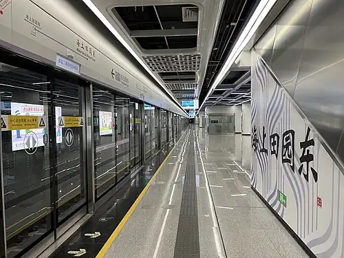 Waterlands Resort East station (simplified Chinese: 海上田园东; traditional Chinese: 海上田園東; pinyin: Hǎishàng Tiányuán Dōng; Jyutping: Hoi2 Seung6 Tin4 Jyun4 Dung1) is a metro station on Line 12 of Shenzhen Metro. It opened on 28 November 2022.[1][2] It was the northern terminus of the line until the extension to Songgang opened on December 28, 2024.[3]