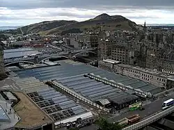 View from the Scott Monument of the Waverley Station roof, in Edinburgh, with Arthur's Seat in the background