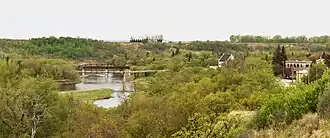 The first pioneers in the area arrived in 1878 when a small settlement was established on the west side of the Souris River and Assiniboine River confluence where a land claims title was set up near to where the trading fort had been established.[6] The site included a post office which was named Souris Mouth though this settlement did not remain long as it was only temporary and meant for homestead registration and not as a settlement.[6] Five years later another post office was set up at Sourisbourg, a community which is located near the present site of the Methven Cemetery, though this community too would not last.[6] Other settlements sprung up in the area including Millford and Souris City which by the 1880s seemed to be thriving towns. However, as with many early prairie settlements, when the bids for railways did not happen these communities quickly faded away.[6] The Northern Pacific Railway instead built its line to Wawanesa, thus dooming Souris City and many of the latter's buildings were moved by ice on the Souris River to the site of Wawanesa.[6]