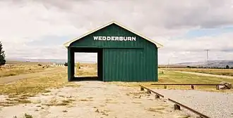 Wedderburn is on State Highway 85 close to the Otago Central Rail Trail.[1] Originally a coaching stop, it became a terminus on the Otago Central Railway in 1921 and headquarters for the Public Works Department during construction of the line section. This section was eventually abandoned due to declining traffic. The line was sustained in the 1980s by carrying materials for the Clyde Dam, which inundated the line between Clyde and Cromwell. However, traffic fell below sustainable levels after the dam's completion, leading to official closure.