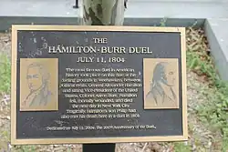 Not far from Deas' was a ledge 11 paces wide and 20 paces long, situated 20 feet (6.1 m) above the Hudson on the Palisades. This ledge, long gone, was the site of 18 documented duels and probably many unrecorded ones in the years 1798–1845. The most famous is the duel between Alexander Hamilton, first Secretary of the Treasury, and Aaron Burr, then Vice President of the United States, which took place on July 11, 1804;[33] this duel was re-enacted on its 200th anniversary (July 11, 2004) by descendants of Hamilton and Burr.[34] Three years earlier, a duel was held at this spot between Hamilton's son, Philip Hamilton, and George Eacker.[35] (Another source, however, puts the duel in Paulus Hook in Jersey City.[36]) Phillip, who had been defending his father's honor, suffered a fatal wound in his hip and his left arm and died two days later on November 24, 1801.[35]