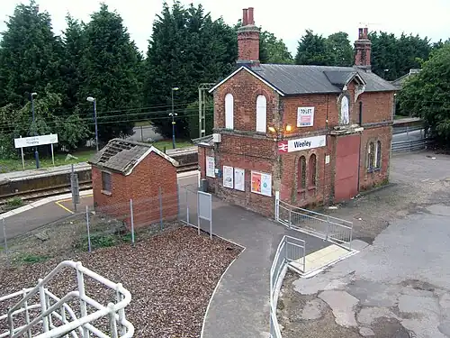 Weeley railway station is on the Sunshine Coast Line, a branch of the Great Eastern Main Line, in the East of England, serving the village of Weeley, Essex. It is 62 miles 78 chains (101.3 km) down the line from London Liverpool Street[1] and is situated between Great Bentley to the west and Thorpe-le-Soken to the east. Its three-letter station code is WEE.