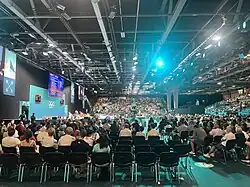 The weightlifting competitions at the 2024 Summer Olympics in Paris took place from 7 to 11 August at the Paris Expo Porte de Versailles.[1][2] Several significant changes were instituted in the weightlifting program for Paris 2024, as the number of categories was trimmed from fourteen in Tokyo to ten. Furthermore, a total of 120 weightlifters, with an equal split between men and women, competed in each of the ten weight classes, a massive drop from the 196 at the previous Games.[3]