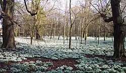 Welford Park is a private residence, and for most of the year neither it nor its grounds are open to the public. However, in a tradition that is now over 50 years old, the grounds are opened to enable visitors to view the year's bloom of snowdrops and, to a lesser extent, aconites. The flowers thrive on the chalky soil, forming a white carpet across the estate's riverside beech woodland.[9]