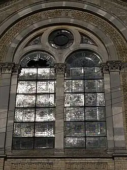 The architecture is in Romanesque style with symmetrical structures in yellow brick. There are three sets of steps with iron railings leading inside, with round arches above the doors, framed with banded piers and entablature. There is a central two paned window with tripartite articulation. The building was Grade II listed on 7 April 1983.[1]