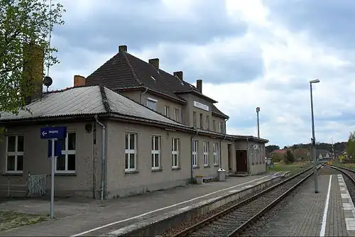 Wesenberg (German: Bahnhof Wesenberg) is a railway station[1] in the town of Wesenberg, Mecklenburg-Vorpommern, Germany. The station lies on the Wittenberge–Strasburg railway and the train services are operated by Hanseatische Eisenbahn.