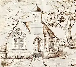 Built of brick on a stone foundation,[3] the church features a distinctive pyramid-shaped roof above the 1888 addition. At one time, the church also included a tower above the entrance; the tower was the portion of the building hit by the 1926 lightning strike, and it was removed as a result.[2] The various architectural elements combine to form a building that is distinctively in the Gothic Revival style.[1]