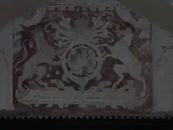 Later on, to remind all the villagers who was king, King James I had his royal coat of arms painted in the Church. This coat of arms can still be seen to this day if one stands in the gallery and looks towards the altar. The motto on the arms reads "Exurgat Deus Dissipenter Ininice", this is the opening line of Psalm 68[42] (Let God arise and let His enemies be scattered). Opposite James's arms is a set of Hanoverian arms acquired in 1816.[43]