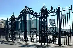 By 1900, when the lease on Stoney Lane expired, the club needed a bigger ground yet again and so made its last move to date. All of Albion's previous grounds had been close to the centre of West Bromwich, but on this occasion they took up a site on the town's border with Handsworth and Smethwick. The new ground was named The Hawthorns, after the hawthorn bushes that covered the area and were cleared to make way for it.[91] Albion drew 1–1 with Derby County in the first match at the stadium, on 3 September 1900.[92] The record attendance at the Hawthorns was on 6 March 1937, when 64,815 spectators saw Albion beat Arsenal 3–1 in the FA Cup quarter-final.[93] The Hawthorns became an all-seater stadium in the 1990s, in order to comply with the recommendations of the Taylor Report.[94] Its capacity today is 26,688,[94] the four stands being known respectively as the Birmingham Road End, Smethwick End, East Stand and West Stand (Halfords Lane).[95] At an altitude of 551 feet (168 m) above sea level, the Hawthorns is the highest of all the 92 Premier League and Football League grounds.[96]