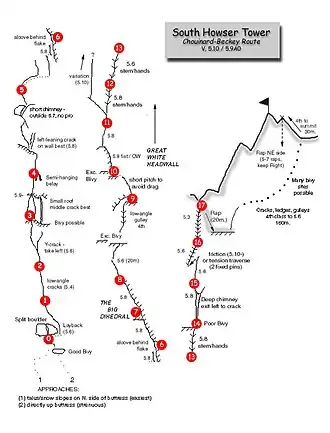The West Buttress of South Howser Tower is a long (up to 17 pitches, plus scrambling) classic climb, considered by many to one of the finest alpine rock climbs in the world. Although the climb is usually almost entirely on solid granite, glacier travel is necessary to access it and descend via the normal rappels on the north face. Access is typically from the Conrad Kain Hut, requiring several hours of glacier travel, and includes steep slopes on snow or ice. A fast party can climb the route in a day from the base, but quite typically the large sandy ledges about halfway up are utilized for a bivouac. Above the ledges rises the Great White Headwall, which provides the crux of the route. The route is typified by crack and dihedral climbing of a classic nature, and affords excellent protection with chocks and cams; there are no bolted anchors. The route is included in the historic climbing book Fifty Classic Climbs of North America.[1]
