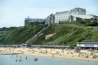 ![]() The beach, cliff railway and cliff-top hotels viewed from the Pier | |