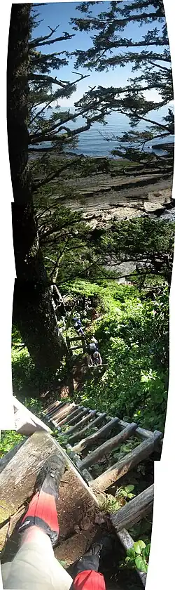 The trail is still extremely rugged and requires a high level of fitness, knowledge, and skill to complete, although in the last 10 to 15 years it has been upgraded to facilitate easier hiking and safety for those with less experience. This has changed the nature and challenge of the trail somewhat but has made it easier for hikers to explore the coast. It has been recommended that hikers travel in groups as a measure of safety, but some also hike the trail solo. To cross the larger rivers and streams hikers must ride cable car suspensions, while smaller or slower waterways are bridged only by fallen logs or may even require wading. There are two waterways that require a boat to cross: the Gordon River, at the southern trailhead, and the Nitinat Narrows, near the midpoint of the trail. A ferry service is operated by the local First Nation. The trail includes some three dozen ladder structures, some of them 30 feet (9.1 m) high, that hikers must ascend or descend. Hikers usually take an average of 7 days to complete the trip, allowing visitors to stop at some point for a day, although it has been run in a single day.[15][16] Approximately 6000 backpackers complete the trail every year, with 1–2% requiring emergency evacuation due to injury, illness, or hypothermia.[17]