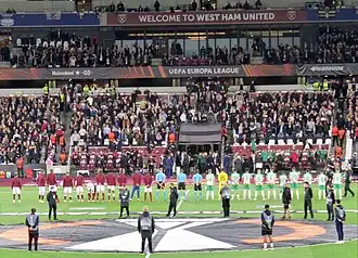 The draw for the third qualifying round was made on 15 July 2016, with West Ham being drawn against Domžale of Slovenia, after they defeated Shakhtyor Soligorsk from Belarus in the second qualifying round.[94] West Ham were originally drawn to play the first leg at their new home, the London Stadium, but due to a clash with the Anniversary Games, the club received permission from UEFA to reverse the order of the legs.[95] The away leg was switched from Domžale's Sports Park ground, to the 16,038 capacity Stožice Stadium in Ljubljana, home of the Slovenia national team.[96] West Ham lost the first leg away in Slovenia on 28 July, with Matic Črnic scoring a penalty in the 11th minute after a handball by debutant Håvard Nordtveit, only for Mark Noble to equalize from the penalty-spot seven minutes later, after Winston Reid was fouled by Domžale's goalkeeper Axel Maraval. Črnic scored a second goal three minutes into the second half to give the Slovenians a 2–1 victory.[97] Seven days later, West Ham hosted Domžale in the club's first ever game in their new home, the London Stadium. West Ham won 3–0 with two goals from Cheikhou Kouyaté and a third from Sofiane Feghouli, resulting in a 4–2 aggregate victory to progress to the play-off round.[98]