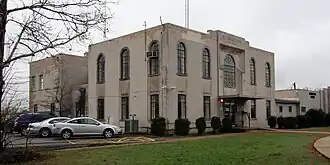 The former West Memphis City Hall is a historic municipal building at 100 Court Street in West Memphis, Arkansas, United States. It is a brick building, whose original 1938 construction consisted of two two-story sections joined by a single-story connector. The front portion of the building housed city offices, while the rear portion housed the fire station and the jail. It was built in 1938 with funding from the Public Works Administration, a Depression-era jobs program. The building was extended to include a courtroom annex in 1944–45, and an enlarged jail annex was added in 1960–61. It no longer houses town offices (which are at 205 South Redding Street); it now houses a police dispatch center and the municipal court.[2]