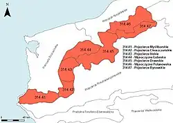 Spanning 9,700 km², it constitutes about 3.1% of Poland's administrative area and 12.6% of the subprovince.[2][4] The macroregion is divided into seven mesoregions: Myślibórz Lake Land, Choszczno Lake Land, Ińsko Lake Land, Łobez Upland, Drawsko Lake Land, Polanów Upland, and Bytów Lake Land.[2] Administratively, it lies within the West Pomeranian Voivodeship and Pomeranian Voivodeship.[5]