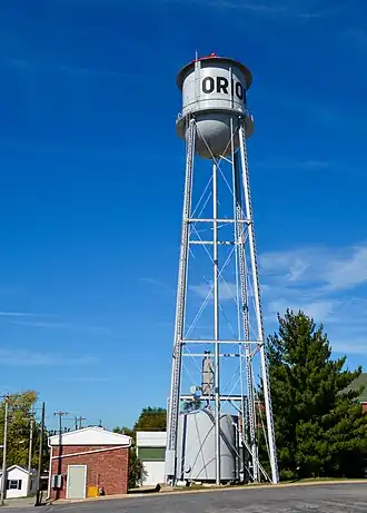 The West Water Tower and Ground Storage Tank are a historic water tower and storage tank located at 310 11th Avenue in Orion, Illinois. The tower and tank were built in 1928 as part of the village's new water system, which had been approved the previous year. The water system was introduced both as a response to several fires which had plagued the village and as an effort to bring modern technology and progress, among other civic concerns. The water tower consists of a steel tank with a hemispherical bottom supported by a steel trestle; the structure is 136.5 feet (41.6 m) tall. The ground storage tank, located at the base of the tower, is made of redwood and holds 30,000 US gallons (110,000 L; 25,000 imp gal) of water.[2]
