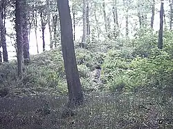 West Woods also contains a Neolithic long barrow, approximately 40 metres long and 27m wide at the widest point, up to 3.5m high, and surrounded by a ditch on all sides.[7][8][9] The wood is bisected by an ancient earthwork known as the Wansdyke, dating back to the 5th or 6th century BC.[10]