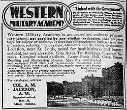 In 1879, Edward Wyman, an 1835 Amherst College graduate, opened a boarding school for boys in what was then Upper Alton, Illinois. Wyman had been an esteemed educator in the St. Louis public schools. A school circular said that Wyman believed the region then called the western United States needed a "boarding school for the proper education of young men." In 1887, Wyman hired Albert M. Jackson to be a member of the staff. Jackson was an 1884 Princeton graduate and had just completed two years of teaching mathematics and Latin at Blair Academy in New Jersey. Upon Wyman's death in 1888, ownership of the school passed to Col. Willis Brown and Albert M. Jackson was made the principal. It was during this time that the school changed its name to Western Military Academy and introduced military training. After eight years at the helm, Col. Brown chose to retire. In 1896 Albert M. Jackson and the academy's financial officer, George D. Eaton purchased Western Military Academy. The Jackson family would retain ownership of the school until it closed in 1971.[1]