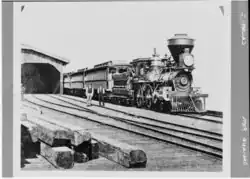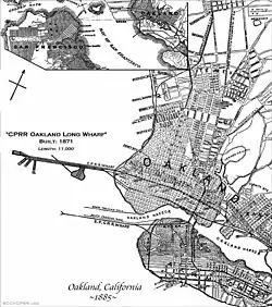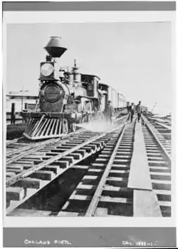 Two months later, the rail connection to the San Francisco and Oakland Railroad was finally in place, as was the expansion of CPRR's Oakland Pier.[13] On the morning of November 8, 1869, the first transcontinental train to use the expanded ferry terminal at Oakland Pier traversed the SF&O and the Western Pacific Railroad to reach Sacramento, and continue eastward on the Central Pacific Railroad. The city of Oakland held a large celebration later in the day to greet the first westbound transcontinental train.[34] Newspaper coverage stated: "New York and Oakland are bound together by ties strapped with iron."[34]