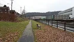 A large flood control project stretching from the 1950s through the '60s included a change to the banks of the Turtle Creek waterway that required the removal of Interworks tracks between Wilmerding and Pitcairn, and the decision was made not to rebuild them. Thus on September 30, 1962, the rail link on the right bank of Turtle Creek between Trafford and Wilmerding was severed, and nearly all of its track between these two boroughs was eventually removed.[7] Most of this track-bed now lies abandoned, save for a fraction of a mile in Wilmerding which became the Airbrake Avenue Walking Trail.[16][17] Proposals exist to convert the rest of the abandoned line into a rail-trail as well.[18]