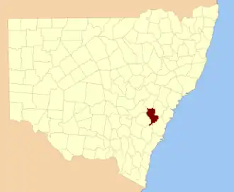 Westmoreland County was one of the original Nineteen Counties in New South Wales and is now one of the 141 cadastral divisions of New South Wales. It is to the west of Sydney in the Blue Mountains. Coxs River is the border to the north, and the Wollondilly River to the east. Campbells River is the border in the north-east, where the county extends to near Bathurst, with the Fish River part of the border. It includes the town of Oberon, and the Kanangra-Boyd National Park.