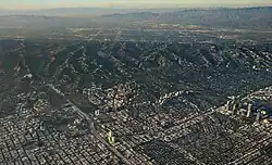 Late afternoon aerial photograph of Westwood (center), with Century City at the far right and the Santa Monica Mountains and San Fernando Valley in the background
