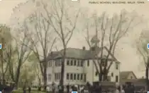 The enrollment for 1889 was enlarged to 190, with an average of 160. In 1913 the present school house was erected. Each time, the bell was moved and employed to call the students to classes. The bell was retired at 84 in 1954 and in 1964 was placed in Memorial Park beside the first school house. Tragically, in 1969 the bell was stolen from the memorial park and never recovered. 1880 was the first graduating class with Regina Gambs Genness as the only graduate. The superintendent for that year was J.S Shoup. Since then there have been graduates all but for 13 years, the last year without graduates was 1902.[8]