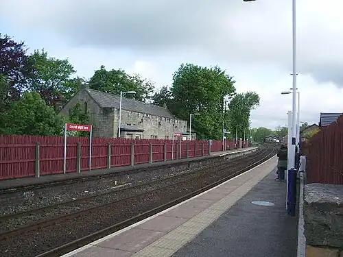 Whalley railway station serves the village of Whalley in Lancashire, England. The station lies on the Ribble Valley Line 7+14 miles (11.7 km) north of Blackburn. The station has two platforms, slightly offset from each other. It is unstaffed, with shelters on each platform.[1] Immediately beyond its eastern end, the line crosses the River Calder on a 678-yard (620 m) long, brick viaduct of 48 arches.[2]