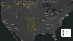 | Hard red winter wheat (HRW) | 40% | High plains, extending from Texas through the largest producing state, Kansas, and continuing all the way north to the Dakotas and Montana.[18][19] | Used mainly in flour production |