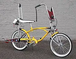 A wheelie bike, also called a dragster,[1] muscle bike, high-riser, spyder bike or banana bike, is a type of stylized children's bicycle designed in the 1960s to resemble a chopper motorcycle and characterized by ape hanger handlebars, a banana seat with sissy bar, and small (16-to-20-inch (410 to 510 mm)) wheels.[2][3][4] Notable examples include the Huffy Dragster series,[1] Schwinn Sting-Ray and Krate lines, and the Raleigh Chopper line. Other notable manufacturers and retailers that offered models include AMF, CCM, Columbia, Iverson, J. C. Penney, Malvern Star, Monark, Murray, Ross, Sears, and Vindec.