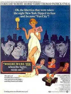 Where Were You When the Lights Went Out? is a 1968 American comedy film directed by Hy Averback and starring Doris Day, Patrick O'Neal and Robert Morse.[2] Although set in New York City during the infamous Northeast blackout of 1965, the screenplay by Everett Freeman and Karl Tunberg is based on the earlier 1956 French play Monsieur Masure by Claude Magnier.[3]