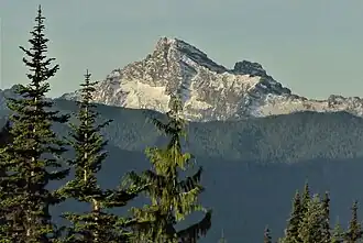 White Chuck Mountain, or native name Hi Khaed,[3] is a 6,989 ft (2,130 m) summit near the western edge of the North Cascades, in Snohomish County of Washington state. It is located southeast of Darrington, Washington, east of the Mountain Loop Highway, and northwest of Glacier Peak, which is one of the Cascade stratovolcanoes. It is situated at the confluence of the White Chuck River and the Sauk River on land administered by the Mount Baker-Snoqualmie National Forest. The mountain is named for the White Chuck River, which "chuck" in Chinook Jargon means "water".[4] The nearest higher neighbor is Mount Pugh, 4.9 miles (7.9 km) to the south-southeast.[1]