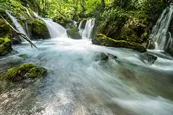 The White Drin Waterfall (Albanian: Ujëvara e Drinit të Bardhë) is a waterfall in the western part of Kosovo. It is located in the Zhleb Mountain within the Accursed Mountains and is situated near the village of Radac, which is 11 km away from the town of Peja. The waterfall is located at the mouth of the White Drin river and is 25 m (82 ft) high. The mountainous scenery surrounds the waterfall, and makes it a popular tourist attraction throughout Kosovo. Other smaller waterfalls are near the area.