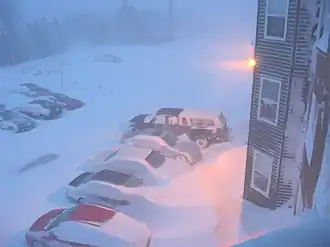 Snow fell at a rate of 5 centimetres (2.0 in) per hour for 12 straight hours, and sustained winds blew at up to 124 kilometres (77 mi) per hour.[1]