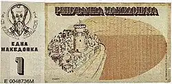 According to historian Donald Sassoon, banknotes depicting the White Tower were created by extreme nationalist organizations in the Republic of Macedonia.[12] VMRO-DPMNE proposed the White Tower-depicting banknotes' official adoption. However, the government in Skopje rejected its official use and adopted a different design for the new denar, which was issued in 1992.[13][14]