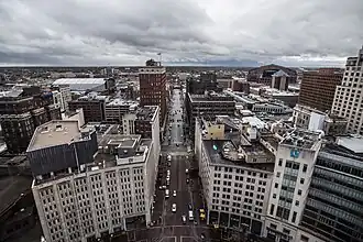 Aerial perspective of the Wholesale District looking south down Meridian Street from the Soldiers' and Sailors' Monument (2015)