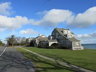 The Wianno area occupies a small portion of the southern coast of Cape Cod in the Osterville section of Barnstable. It includes a series of waterfront properties on Sea View Avenue extending from Warren Street to Wianno Avenue, and extends a short way along Wianno, including a few properties lacking direct access to the water. The central focus of the district is the Wianno Club, a large Shingle/Colonial Revival structure designed by Horace Frazer and built in 1881 to replace the grand c. 1873 Cotocheset House hotel, which had burned down. The colony had been planned in the 1870s by wealthy interests from Boston, New York City, and the local area, which had bought up most of the land on a speculative basis, built the hotel, and sold of parcels for summer houses. The result was a series of handsome "cottages", large two-story wood-frame structures that are predominantly Shingle style. These houses are typically somewhat rambling in character, often with gambrel roofs, and with porches, projecting gables, and dormers to give visual interest. They are set on larger lots (typically 1 acre (0.40 ha) or more).[2]
