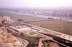Around 1960, the city administration, under Mayor Franz Jonas, decided to establish a horticultural exhibition on the area between the Hubertusdamm of the Danube, Wagramer Straße, and the Old Danube, north of the Reichsbrücke, the city's most prominent Danube bridge. This decision was also aimed at eliminating a waste disposal site on part of the area, as well as removing the remnants of an extensive informal settlement known as "Bretteldorf."