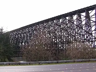 The trestle was originally completed in 1904[2] as part of the Northern Pacific Railway's Lake Washington Belt Line from Black River Junction (south of Seattle) to Woodinville. It was subsequently rebuilt four separate times, in 1913, 1924, 1934, and 1943, due to deterioration of the timber.[1] In 1973, a road, the Lake Hills Connector, was cut through the trestle, replacing a short section with concrete piers and steel deck girders.
