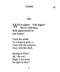 "Wild Nights – Wild Nights!" is an 1861 poem by Emily Dickinson.[1] It was included in her posthumous collection of Poems, Second Series, published November 9, 1891.[2]