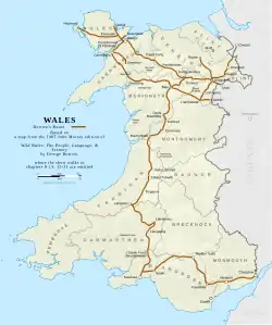 Borrow gives a detailed account of his journey and starts his travels into North Wales from Chester, passing en route through Wrexham, Llangollen, Corwen and Betws-y-coed to Bangor, Anglesey, Caernarfon, Bala, Machynlleth and then south, through Mid Wales to Tregaron and Lampeter, Devil's Bridge, Cwm Ystwyth and Pont-rhyd-y-groes, eventually arriving in some of the industrial areas around the South Wales coalfields, such as Brynamman, Merthyr Tydfil and Pontardawe, before visiting Swansea and Neath and leaving the country via Caerphilly, Newport and Chepstow.