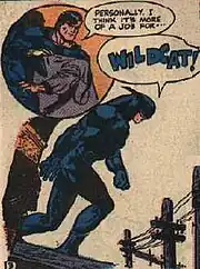• The Yellow Wasp – A wasp-themed criminal who wields a stinger gun, rides the Waspmobile, and uses chemicals to control wasps. He went on a crime wave and kidnapped "Stretch" Skinner before being defeated by Wildcat.[30] The Yellow Wasp later escapes from prison, kills the usurper of his gang, and leads his gang in a raid on Fetterman Arms Works. He and his gang are defeated by Wildcat and "Stretch" Skinner and the Yellow Wasp is returned to prison.[31] The Yellow Wasp later escaped from prison and came up with a crime spree that revolved around him having a large swarm of wasps blanketing the sky. During a fight in the subway, Wildcat and "Stetch" Skinner defeated the Yellow Wasp and his men and returned them to prison.[32] He later dies at some point and is revealed to be the father of Killer Wasp.[33]