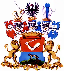 Wilhelm was the son of Jacob Freiherr Lenk von Wolfsberg, Colonel and Knight of the Military Order of Maria Theresa. He married on June 24, 1833, in Mainz Eveline Aloisia Schreher (b. November 2, 1810, Mainz; d. January 7, 1871, Troppau). They had five children. Rudolf (1834-1907), the eldest son, was an Austrian General, too. One of his daughters, Malwine (1839-1866), married the Austrian General Constantin Buol von Wischenau (1822-1893), the youngest, Friederike Berta (1843-1906), was the spouse of the deputy of the Austrian Imperial Council and large landowner's Karl Freiherr Putz von Rolsberg (1852-1921). She was the ancestress of the children of Count Alexander, son of Baron Alexander Wassilko von Serecki.[28][29]
