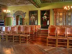 The palace is a four-winged structure with a nearly square floor plan. The comprehensive facilities include an outdoor parade grounds, a gatekeeper's house, pleasure gardens, a kitchen garden, a prison tower, stables, a bakery and a brewery. The spatial arrangement is typical for a residential palace. The halls were decorated with scrollwork and strapwork and adorned with decorative paintings, including a copy of the Iwein epos by Hartmann von Aue the basement.