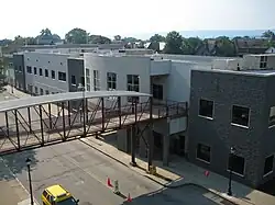 In 2005, the university acquired the former Wilkes-Barre Call Center building and parking garage on South Main Street.[54] The parking garage is currently being used for student and faculty parking. The Public Safety department has remodeled and relocated to the basement of the garage.[55] The Call Center building was renovated and renamed University Center on Main.[54] The building now houses recreation facilities including tennis and basketball courts, and a rock climbing wall.[56] In summer 2014, the building was renovated to also house the Sidhu School of Business and Leadership. On August 11, 2021, the center was formally named after Ron and Rhea Simms to be known as Simms Center on Main.[57]