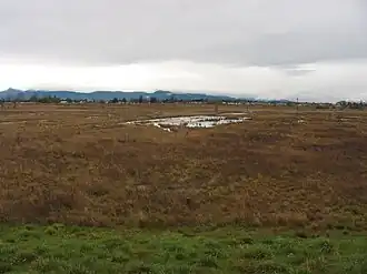 The Portland/Vancouver Basin ecoregion (named for the cities of Portland and Vancouver) is a geological depression at the base of the Portland Hills fault-block. It contains the confluence of the Willamette and Columbia Rivers and is composed of deltaic sands and gravels deposited by Pleistocene floods, notably the Missoula Floods. Elevation varies from 0 to 300 feet (0 to 90 m), with buttes as high as 650 feet (200 m). Historically, the basin was characterized by Oregon white oak groves and Douglas-fir forests on the uplands; black cottonwood groves on riverbanks and islands; Oregon ash, red alder, and western redcedar in riparian areas; and prairie openings maintained by Native American burning, with camas, sedges, tufted hairgrass, fescue, and California oatgrass. Numerous wetlands, oxbow lakes, and ponds can still be found, but today the region is dominated by urban and suburban development, pastures, cropland, and tree farms. The climate is usually marine-influenced, but easterly winds from the Columbia River Gorge periodically bring continental temperature extremes. The region covers 305 square miles (790 km2) in Washington and 269 square miles (697 km2) in Oregon, including the northern and eastern suburbs of the Portland metropolitan area. It contains several National Wildlife Refuges within the Ridgefield National Wildlife Refuge Complex.[2][3]