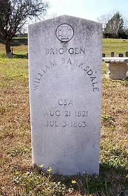 After the war, in January 1867, Barksdale's remains were exhumed and sent to South Carolina;[1] then, later interred in the Barksdale family plot of Greenwood Cemetery, Jackson, Mississippi, with no marker, but he has cenotaphs in both Greenwood Cemetery and in Friendship Cemetery, Columbus, Mississippi.[8][1]